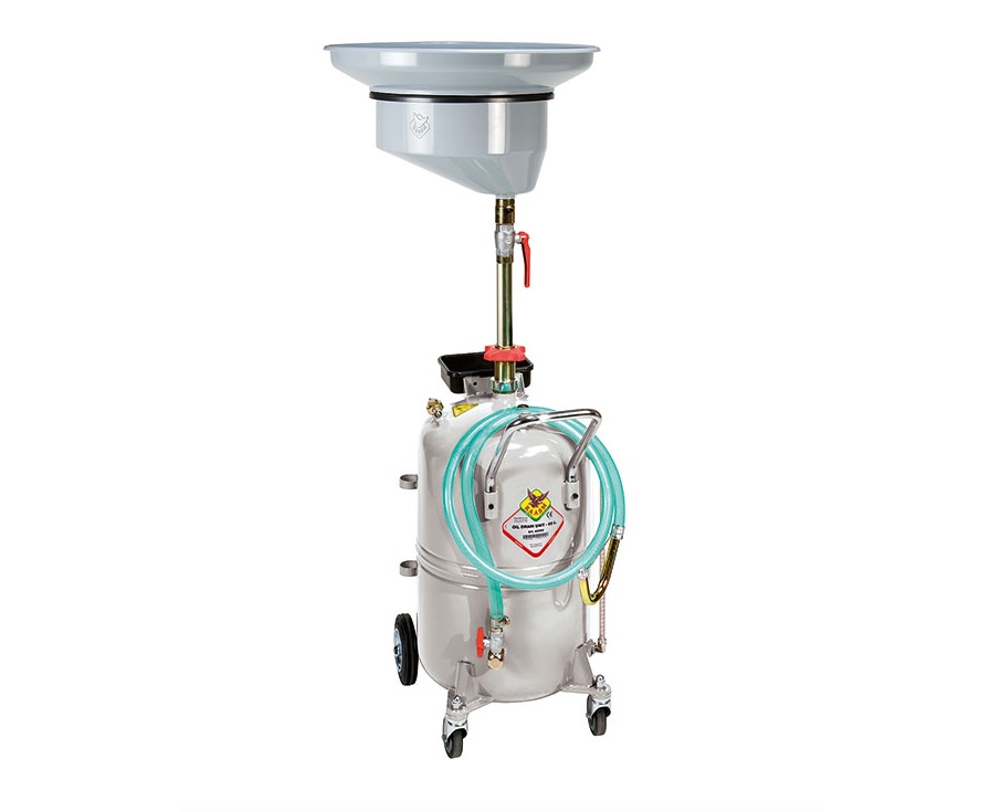 Установка для слива отработанного масла RAASM 42090/C1, предназначена для удаления самотеком моторного масла, масла коробки передач и дифференциала всех автомобилей установленных на подъемнике или яме. Установка представляет собой мобильное и простое устройство, состоящее из маслосборника 15 литров с регулируемой высотой, накопительного резервуара ёмкостью 90 литров, указателя уровня, сливного шланга длиной 2 метра с изогнутым металлическим наконечником, съемного лотка для инструмента.